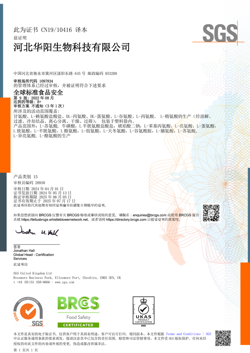 河北華陽集團坐落于河北省衡水市冀州區(qū)省級工業(yè)園區(qū)(始建于1987年,前身為冀州市華陽化工有限責(zé)任公司)。集團下屬四個公司:河北華陽生物科技有限公司、河北華悅氨基酸科技有限公司、滄州華晨生物科技有限公司、衡水市陽力商貿(mào)有限公司。主要生產(chǎn)甘氨酸、L-丙氨酸、L-蘇氨酸、DL-蛋氨酸、L-賴氨酸鹽酸鹽、L-半胱氨酸鹽酸鹽、干貝素等氨基酸系列食品級產(chǎn)品,廣泛應(yīng)用于食品、飲料、飼料等行業(yè)。......